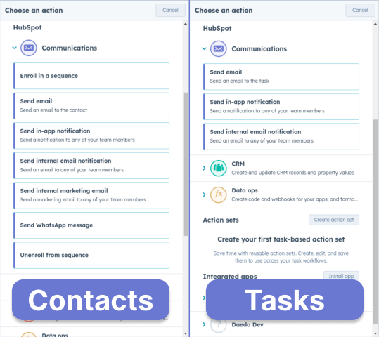 Finally, be aware that different workflow types have different available nodes. For instance, it probably won't surprise you that a "Contact" type workflow has way more communication category nodes that a "Task" workflow does.