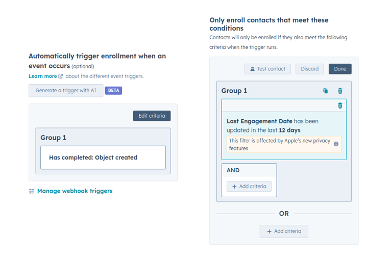 | Whenever a contact goes cold, I want to execute a nurture sequence. | Contact | Property Changed (Last Engagement Date) |