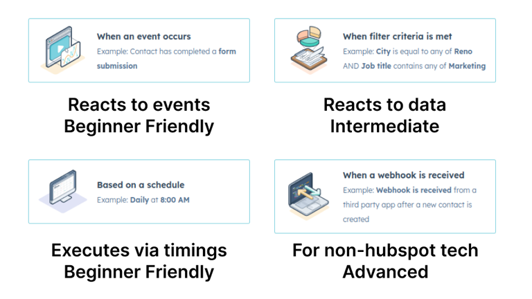 As a beginner, you'll only want to focus on the first trigger type - activating a workflow when an event occurs.