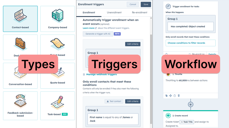 Workflow types are easy, they are broad categories of "What type of HubSpot record changed" - here are the common ones: